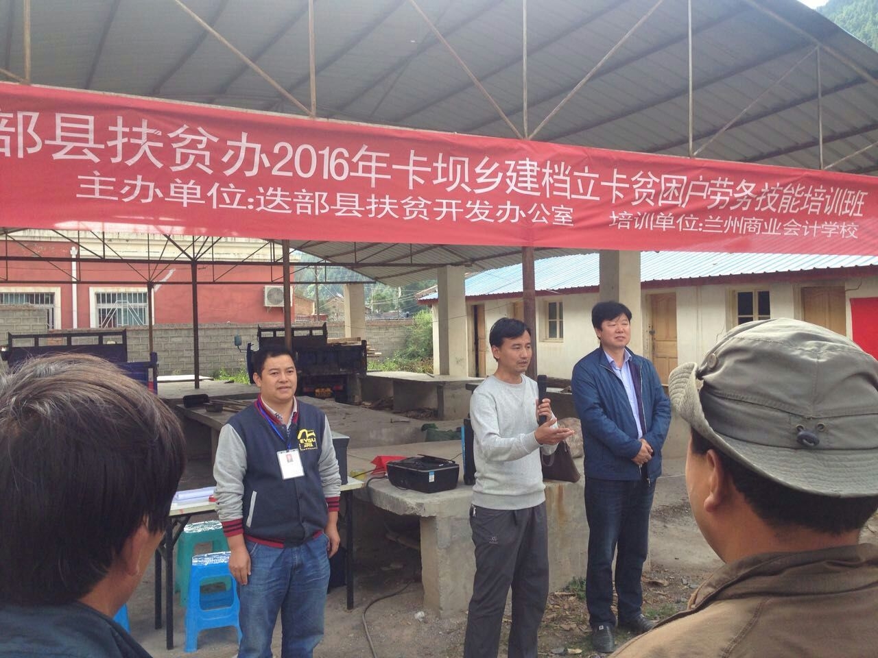 为贯彻落实省市县精准扶贫工作会议精神,全面提升贫困农民就业能力,促进劳务输出由体力型向技能型、数量型向质量型转变。迭部县扶贫办委托兰州商业会计学校于9月13日上午在农贸市场院内正式举办开班。此次培训由卡坝乡人民政府组织,参加培训班开班仪式的领导有:迭部县扶贫办副主任鲁永杰,卡坝乡乡长杨建国,兰州商业会计学校技能培训部主任刘建斌。